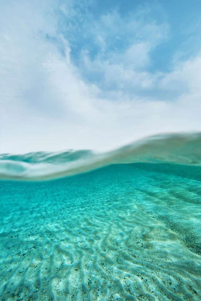 To achieve a split-sea photo frame is quite difficult and involves many factors. Most important is to have calm sea with gentle waves. The camera has to be in vertical position so that we have enough “information” at the top (sky) and lower (sea bottom) part of the frame. The camera should be aligned with the horizon and our wide-angle lens to be positioned in the middle of the water surface. Before shooting we must be focused above the water surface. Camera requires to be set to spot-focous in order to have maximum control on the result we expect, it is also very helpful to put the spot-focus at the other part of the frame that will be above water-surface. Otherwise the camera will be “confused” and will focus at the sky.