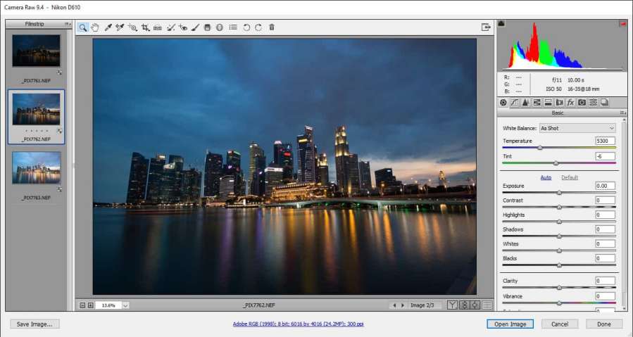 Before bringing the files into Adobe Photoshop, I make sure that all RAW files are at their best conditions. First, ensure that both files have the same white balance value. Second, regain detail in highlight and shadow as much as possible.