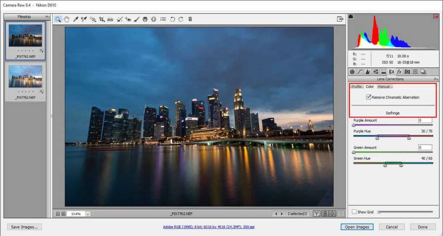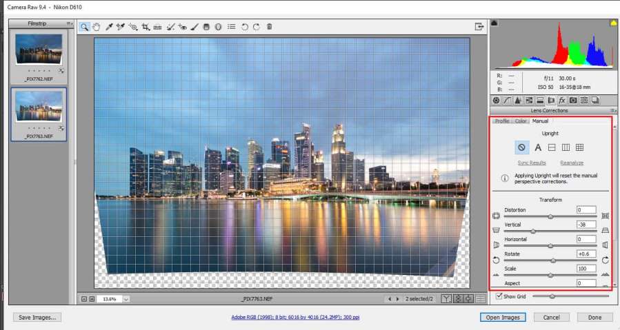 I then proceed to adjust these RAW files in Adobe Camera Raw. You can use Adobe Lightroom as well as they are very similar. In cityscape and architectural photography, it is crucial to have little to none distortion and perspective problems. In these software, you can automatically correct your distortion, chromatic aberration (purple edge on highly contrast area), and manual distortion for perspective correction. While shooting, I tilted the camera up a little so I will have to reduce ‘Vertical’ on manual adjustment. Make sure you correct two files together to avoid any misalignment or you can copy all setting values from one to another.