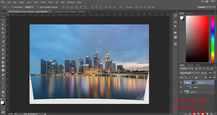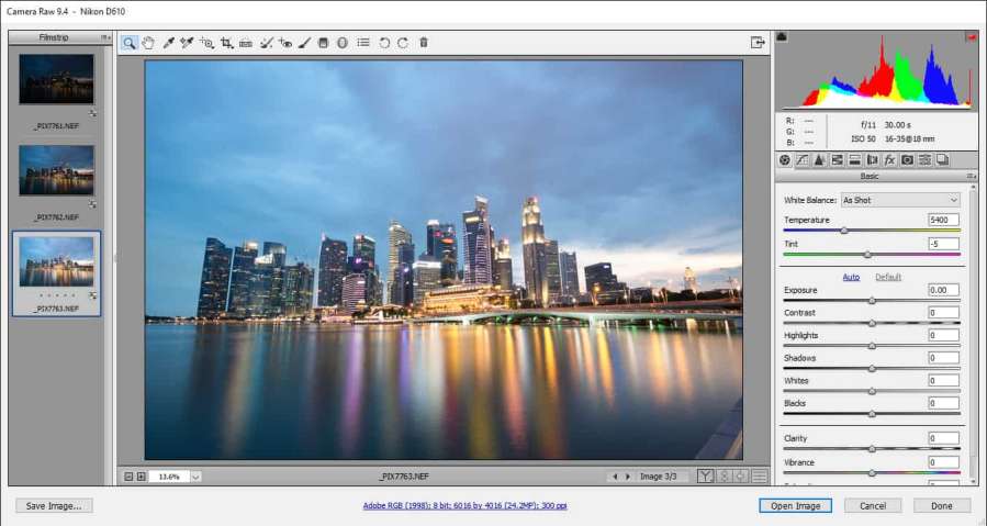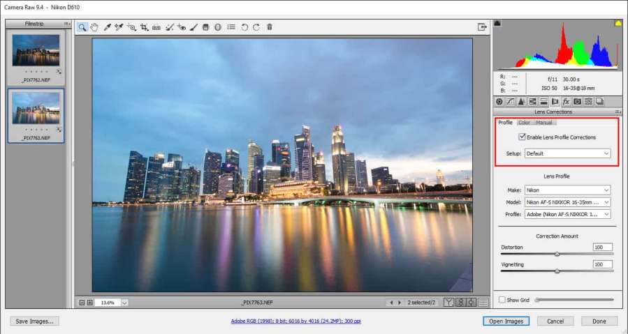 I then proceed to adjust these RAW files in Adobe Camera Raw. You can use Adobe Lightroom as well as they are very similar. In cityscape and architectural photography, it is crucial to have little to none distortion and perspective problems. In these software, you can automatically correct your distortion, chromatic aberration (purple edge on highly contrast area), and manual distortion for perspective correction. While shooting, I tilted the camera up a little so I will have to reduce ‘Vertical’ on manual adjustment. Make sure you correct two files together to avoid any misalignment or you can copy all setting values from one to another.