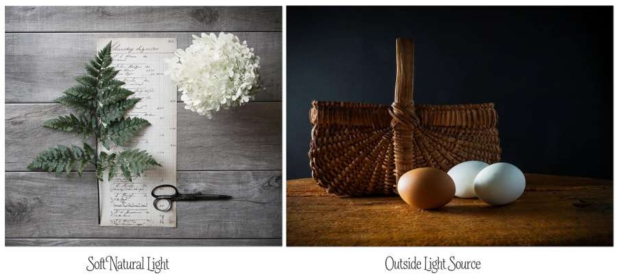 I like to use natural light, but will also use a good diffused light source when needed. Having a large window to work near will give you great natural light. If your separate light source is too harsh it can been diffused with a velum type paper or by draping sheer white fabric over the source. Just make sure that the material you diffuse your light with is not touching the bulb. Setting your camera to Auto White Balance is a good place to start if you have good light. My examples here show you natural light vs. another light source. Both can be used to advantage.