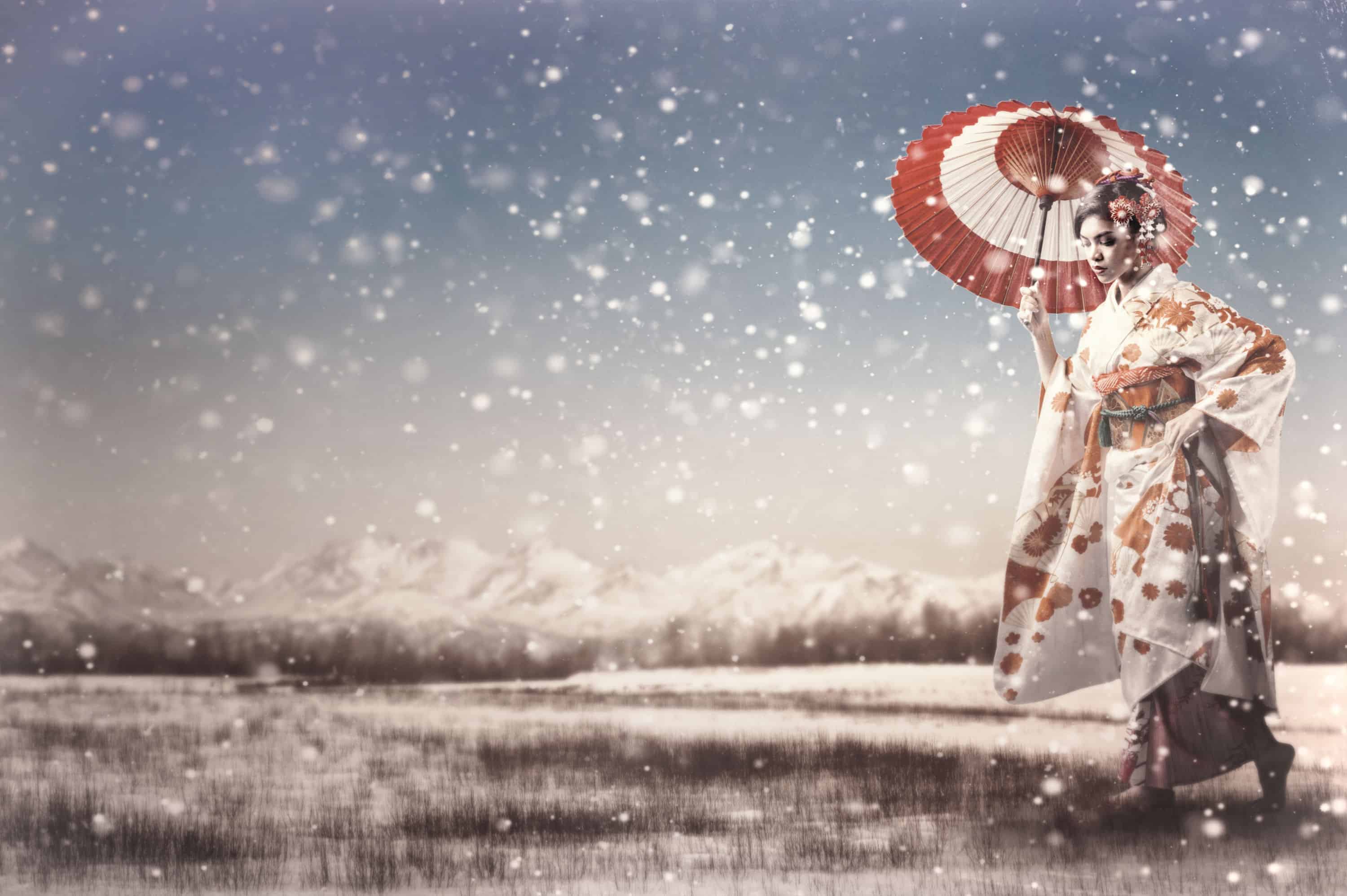 What I used: Photoshop, OneOne Photo 10 (easy blue screen removal) and Mystical Suite Gen1 (snow effect). Another thing you’ll need is an imagination! The first thing I started with was finding a model and costume. I live in Japan, so Kimono’s are readily available for about $280 for a nice one like this. I shot this against a plain medium blue background with 2 lights, one 60″ softlighter II umbrella on the subject up high camera left and one bare speed light on the background to even out the blue color. You can see my RAW image of the model and there’s a lot of wrinkles and color variation, but it won’t matter in the end (planning the shot is key here).